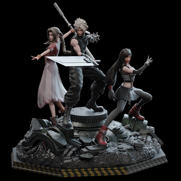A highly detailed diorama of Cloud, Tifa & Aerith from "Final Fantasy 7"